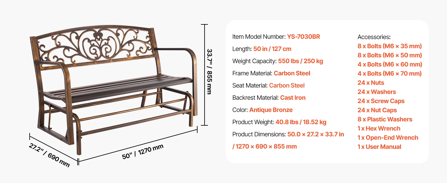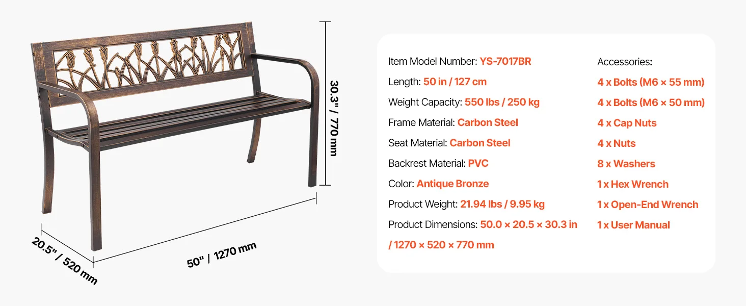 • Spacious Seating: With overall dimensions of Metal 22.4 x 38.8 x 31.1 inches/20.7 x 45.8 x 28 inches/ 20.7 x 50 x 32.2 inches, Wooden 25 x 48 x 37 inches / 22 x 50 x 34.4 inches / 14.3 x 63 x 19 inches  this outdoor garden bench can comfortably seat 1-3 people, making it ideal for gardens, parks, patios, or porches to enjoy the tranquility of nature and relax.