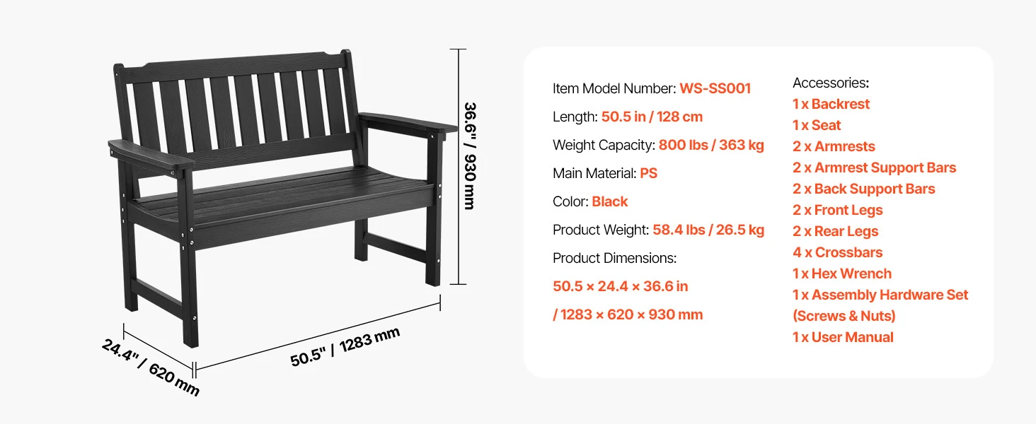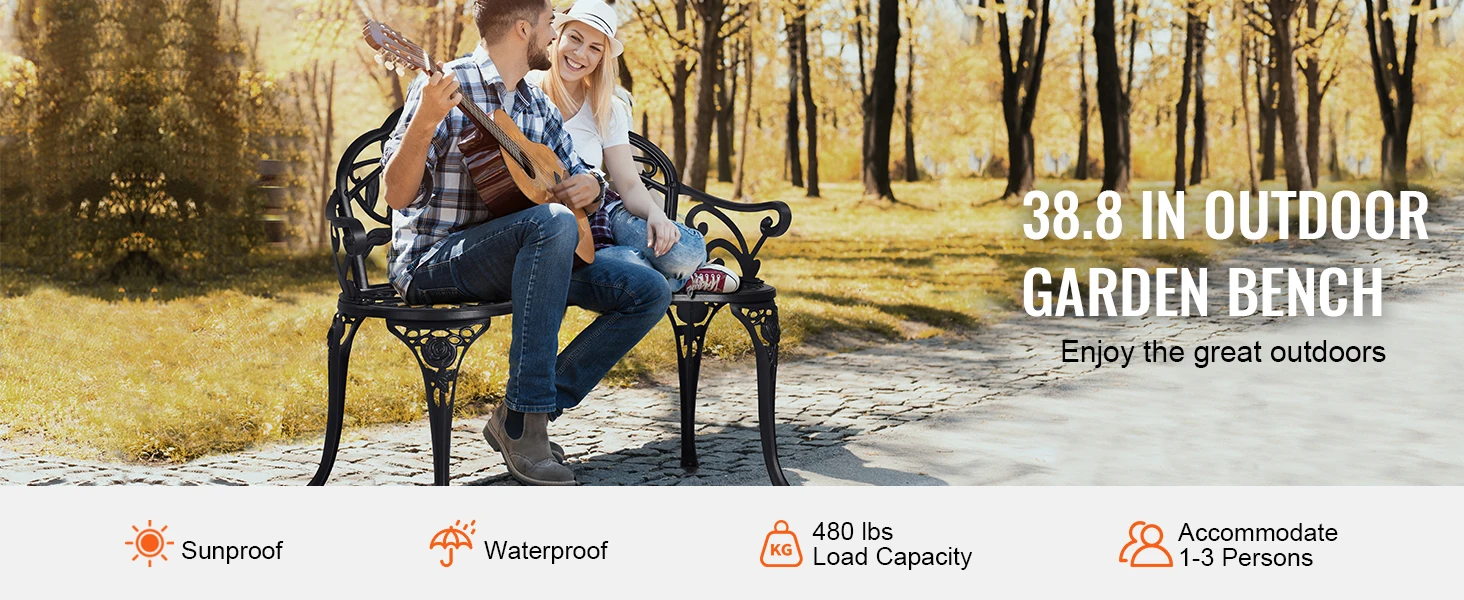 • Built for the Outdoors: This outdoor bench features a high-quality metal frame with a waterproof powder coating, ensuring durability in various weather conditions. It resists corrosion, deformation, and damage, supporting up to 480 lbs/218kg to accommodate users of different sizes.