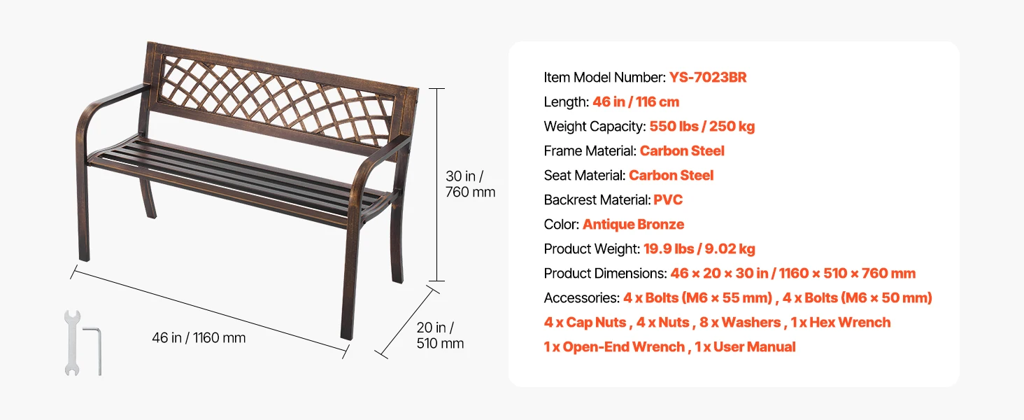 Our outdoor metal bench is easy to assemble, requiring no complicated tools or steps. Enjoy your outdoor space quickly and effortlessly, whether at home or in a park.