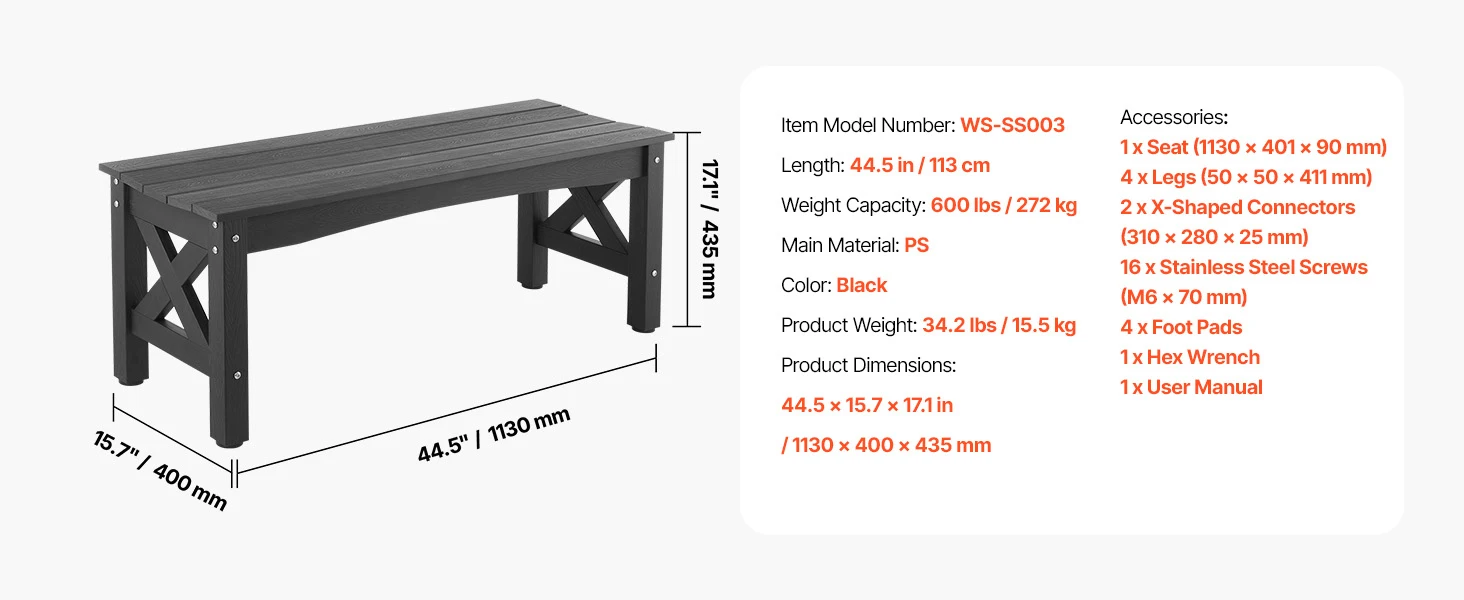 The outdoor bench supports up to 480 lbs and features a spacious design that comfortably seats 1-3 people. Whether you’re enjoying solitude or spending quality time with friends and family, our bench meets all your needs.